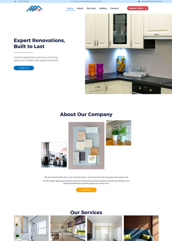 Sandton-based home renovation website showcasing kitchen, bathroom, and living space services with quality-focused messaging and local targeting for homeowners and small businesses.