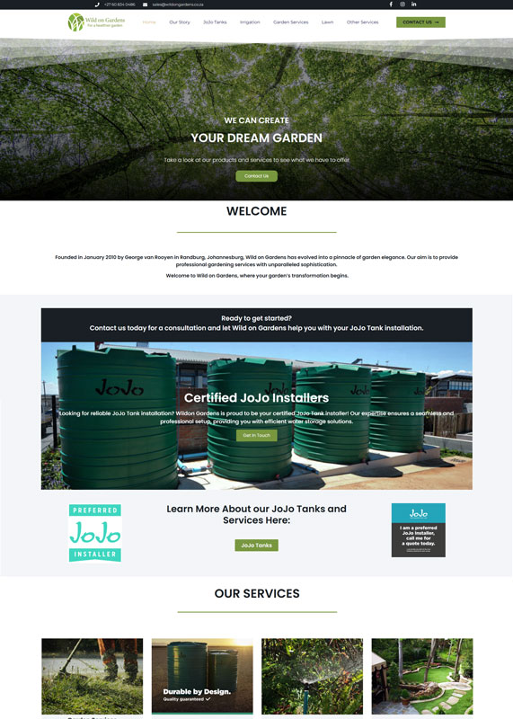 A consultation-focused website for a South African gardening services company that specializes in JoJo tank installations and emphasizes personalized service through clear contact forms and service-oriented messaging.
