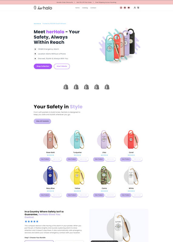 A South African personal safety e-commerce platform built on Shopify that sells 130dB emergency alarm devices with phone-free location alerts, featuring bundle pricing and multiple color variants.