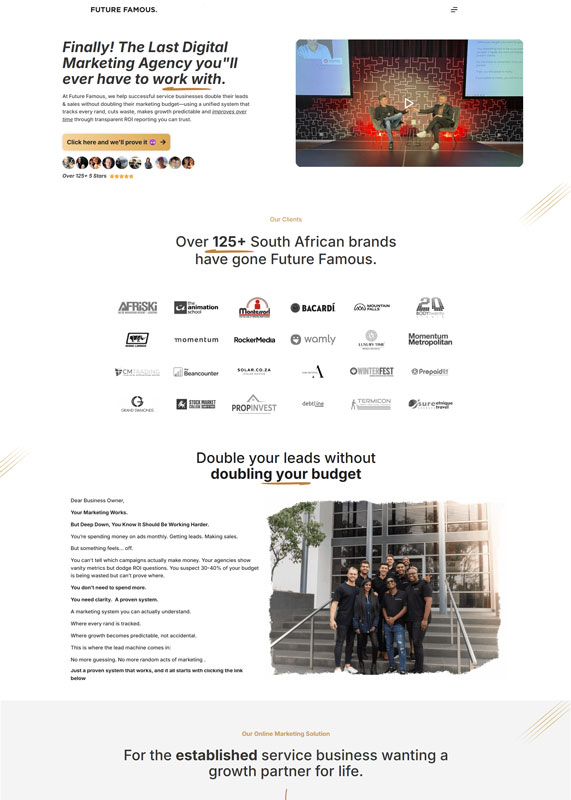 A conversion-focused landing page for a South African marketing consultancy that uses pain-point driven copy and direct response principles to capture leads from business owners frustrated with unclear marketing ROI.