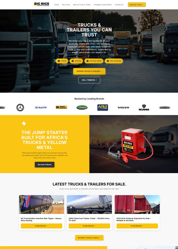 A South African heavy vehicle marketplace built on Shopify that combines truck and trailer listings with direct WhatsApp integration, free valuation services, and industry-specific accessories targeting commercial transport operators.