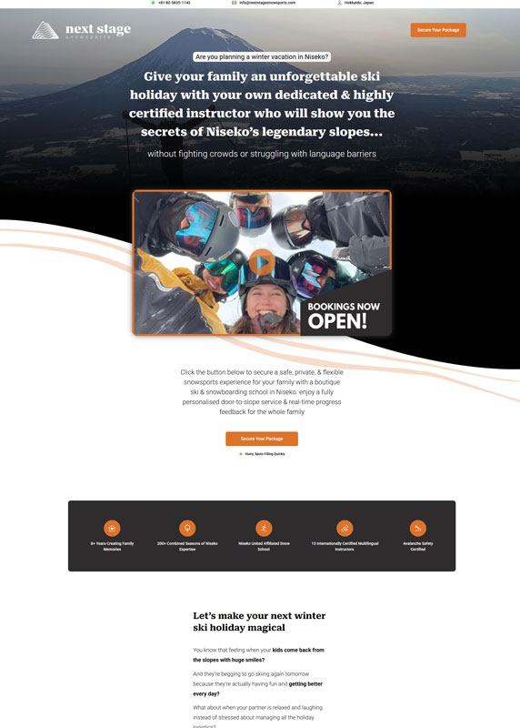 A conversion-optimized booking platform for a boutique Niseko ski school that combines long-form sales copy, multilingual instructor profiles, and premium package pricing to target affluent Asian families seeking private snowsports instruction.