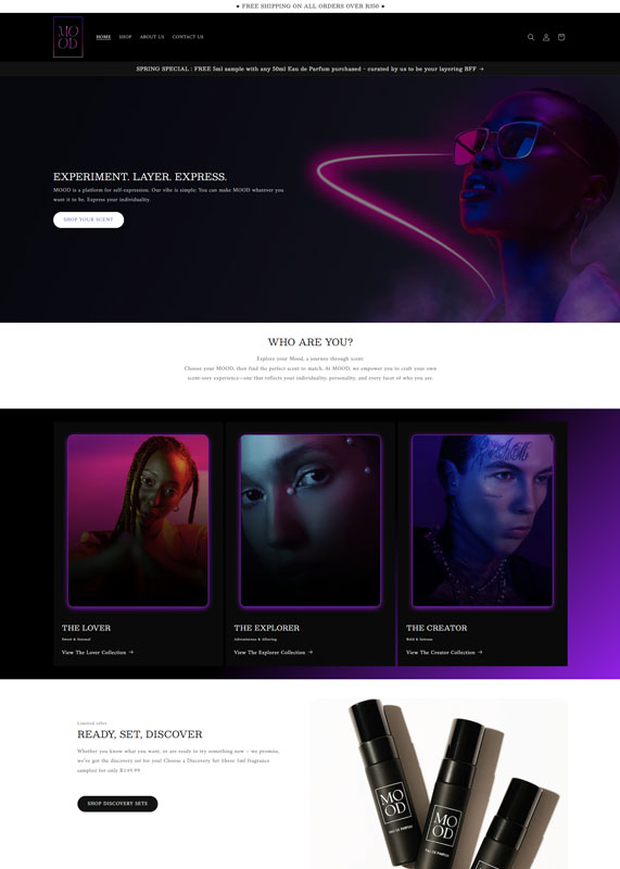 A South African fragrance e-commerce platform built around mood-based scent discovery, featuring sample-first purchasing with Discovery Sets, scent layering education, and community-driven branding targeting Gen Z fragrance enthusiasts.