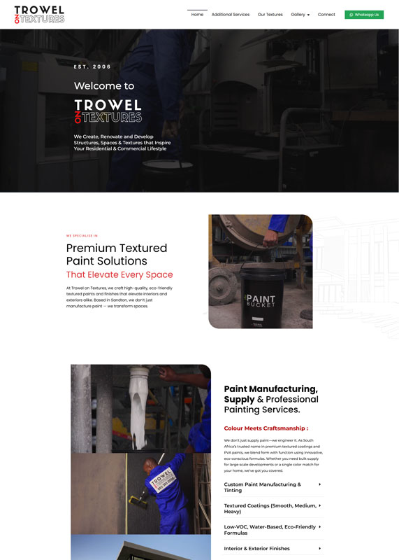 A South African paint manufacturing and construction services website that showcases vertically integrated capabilities from custom eco-friendly paint production to full turnkey renovation projects, targeting both residential and commercial markets.